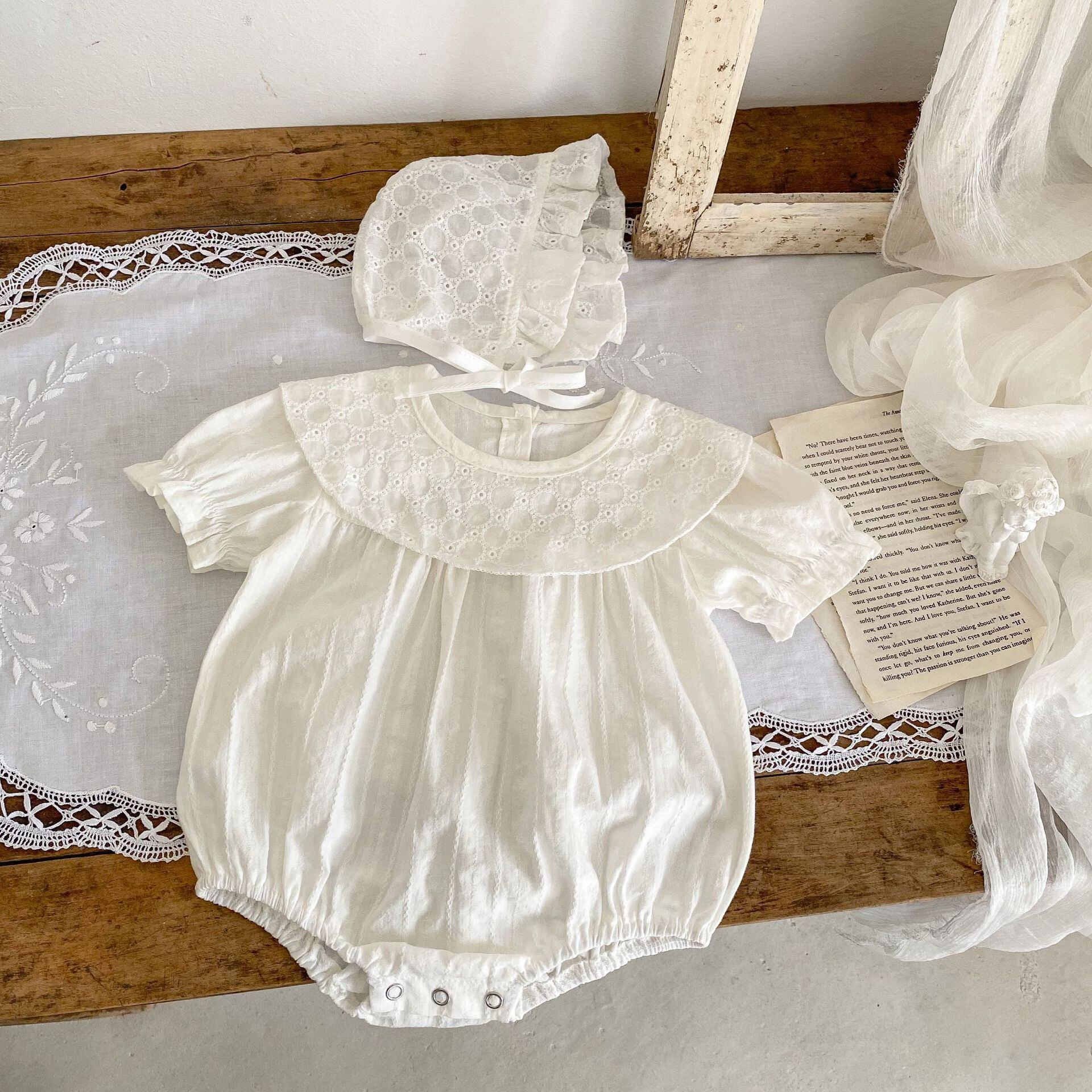 BABY ボンネット付き刺繡襟 ロンパース
